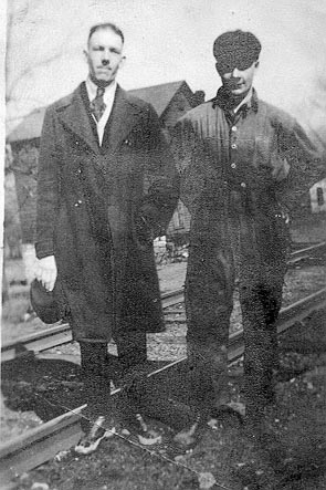 This is a picture of my great-grandfather, Harry Alfred Clawson, that was taken when he was at work. He is standing on the right. It is believed that a Pennsylvania RailRoad official is standing on the left.