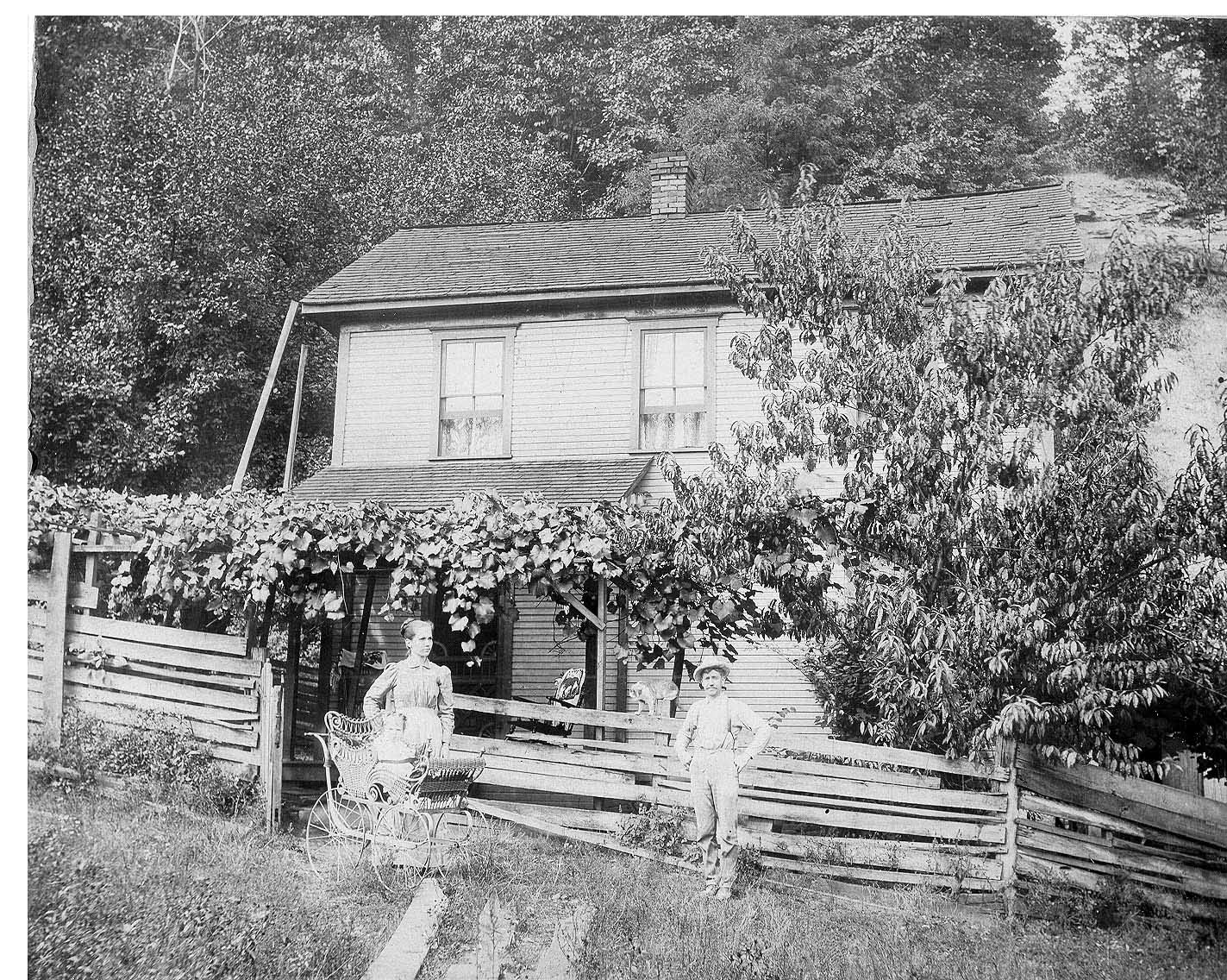 I am not sure who these people are. I think that is my grandmother, Florence (Miller) Clawson, in the baby buggy. The other two people are probably her parents, Matthew and Gertrude (Pittman) Miller. This picture would have taken around 1900. |