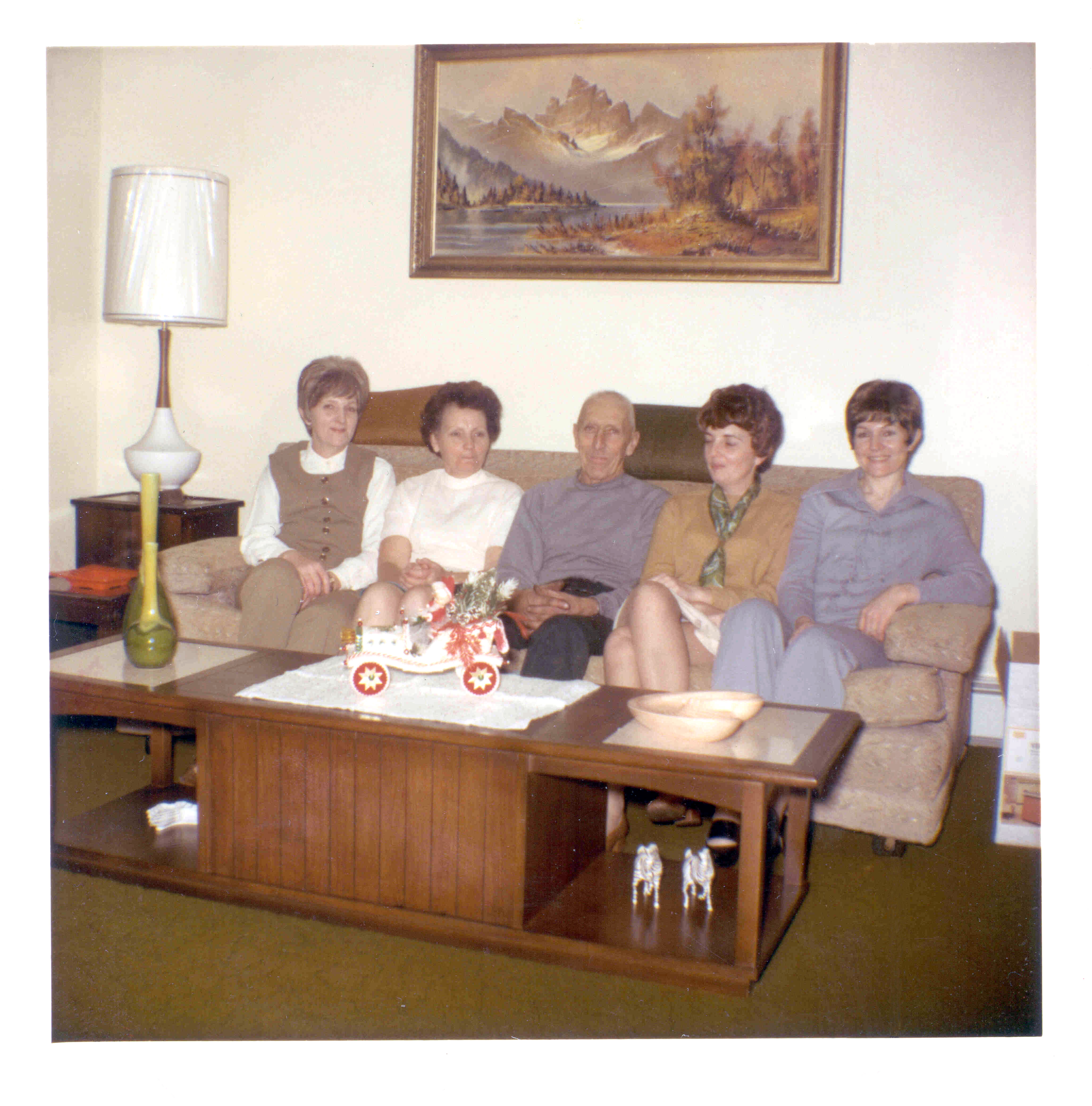 This a picture of my grandparents, Bill and Dot Stewart, with their children. From left to right, my mother (Ginger), my grandmother (Dot Stewart), my grandfather (Bill Stewart), Sandy, and Billie.  This was taken at my grandparents' house in the late 1960's or early 1970's. |