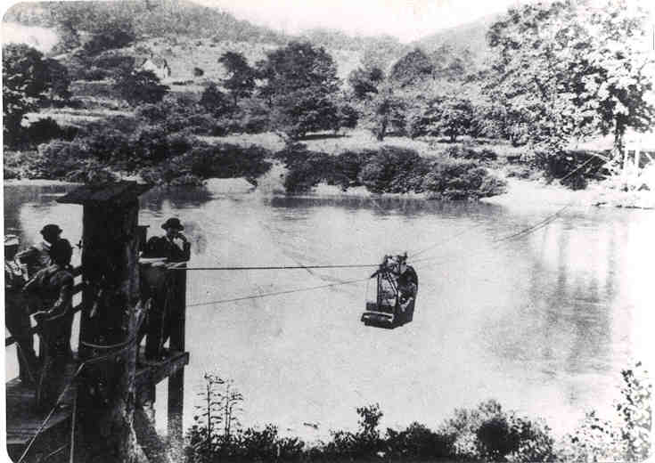 This is a picture of the 'Bug Trap' designed by Davis Benjamin Clawson. He used it so he could cross the Conemaugh River between his home in Climax and his work in Lockport. Davis is standing on the platform with railroad officials and reporters from Pittsburgh. |